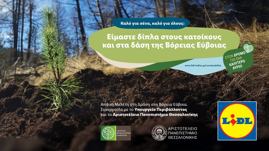 Η Lidl Ελλάς, διαθέτοντας 500.000€ για τη στήριξη της αποκατάστασης των πληγέντων οικοσυστημάτων της Βόρειας Εύβοιας ολοκλήρωσε μια σειρά έργων, σε συνεργασία με το Αριστοτέλειο Πανεπιστήμιο Θεσσαλονίκης και το Υπουργείο Περιβάλλοντος και Ενέργειας . Η εταιρεία είχε ήδη διαθέσει το συγκεκριμένο ποσό για να στηρίξει την αποκατάσταση αυτών των πολύτιμων οικοσυστημάτων, χρηματοδοτώντας μελέτες και στηρίζοντας δράσεις αναδάσωσης, αποκατάστασης του φυσικού περιβάλλοντος, καθώς και προστασίας και βέλτιστης διαχείρισης των φυσικών πόρων του τόπου μας.
