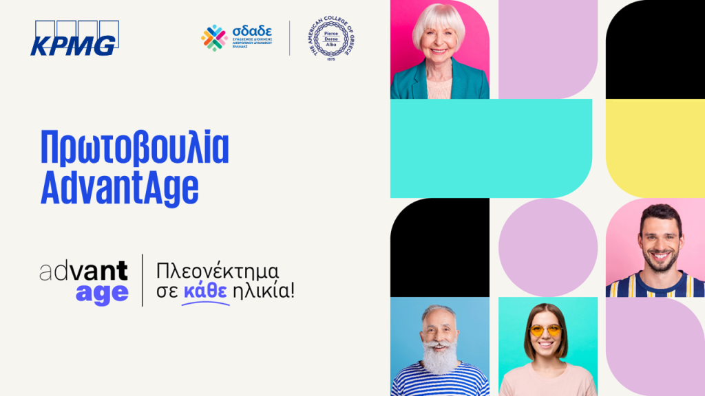 Η πρωτοβουλία “AdvantAge: Πλεονέκτημα σε κάθε ηλικία” έχει ξεκινήσει από την KPMG στην Ελλάδα, σε συνεργασία με τον Σύνδεσμο Διοίκησης Ανθρώπινου Δυναμικού Ελλάδας (ΣΔΑΔΕ) και με την υποστήριξη του Αμερικανικού Κολλεγίου Ελλάδος. Επικεντρώνεται στην ανάγκη ευαισθητοποίησης της επιχειρηματικής κοινότητας και της κοινωνίας στο πρόβλημα της ηλικιακής διάκρισης (ageism) στο χώρο εργασίας. Μέσω δράσεων που προωθούν ίσες ευκαιρίες απασχόλησης για όλους, ανεξαρτήτως ηλικίας, η πρωτοβουλία αυτή αποσκοπεί στη δημιουργία ενός πιο δίκαιου εργασιακού περιβάλλοντος.